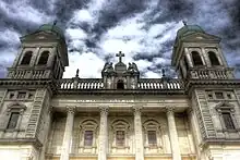 While often likened, at least in its outward form, to St Paul's Cathedral in London, it is conceivable that the greatest influence behind this structure was Benoit Haffreingue. During Petre's formative years, Haffreingue had been the driving force of the reconstruction of the Cathedral of Notre Dame in Boulogne-sur-Mer, a French church that has a very similar plan to that of the Cathedral of the Blessed Sacrament, including the controversial siting of the dome over the altar rather than the centre of the cathedral.[16] Haffreingue was also the principal of a private Jesuit boarding school for boys (now known as "Le collège Haffreingue-Chanclaire") in Boulogne-sur-Mer. Petre was a student at this school in 1860–186, during Heffreingue's tenure.[17] The building was also said by some to be based on the 19th-century Church of Saint-Vincent-de-Paul, Paris, to which it bore some striking similarities.[2] The similarities to another great French church, Saint-Sulpice, Paris (17th century), have also been remarked upon.[18]