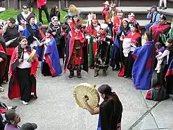 The event consists of a five-day program of activities, starting with the Grand Entrance, a parade of all dance groups through Juneau and into Centennial Hall.[2] Regular activities include workshops on the Tlingit, Haida, and Tsimshian language, Northwest Coast art, and Southeast Alaska Indian cultures and historical events; canoe racing; dance performances; film screenings; poetry gatherings; and a Native fashion show.[5][6][2] The Celebration also sponsors traditional food contests, including soapberry and black seaweed, to introduce people to traditional Native foods and highlight the health benefits of these foods.[7]