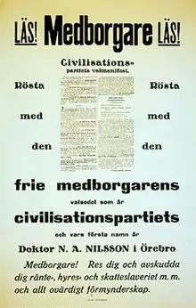 The Civilization Party contested the 1924 parliamentary election and the 1926 municipal election with ballots carrying the title 'Workers Party/Social Democrats' and the subtitle 'Civilization Party'.[5] These ballots carried Dr. Nilsson as the first candidate, but with prominent Social Democrats filling up the rest of the ballot. The concerned Social Democrats protested against Dr. Nilsson's move, as he had put them on the ballot without their consent.[5] The Civilization Party obtained 447 votes in the municipal elections in Örebro in 1926.[5][6] The party was able to get one member elected to the municipal council.[6] The Centre Party contested the 1932 parliamentary election under its new name.[7]