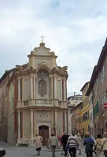 The Chapel of the Madonna del Rosario is a small, Baroque style, originally Roman Catholic, but now deconsecrated oratory or church located between via San Marco and via della Diana in the contrada of the Chiocciola (snail), in the city of Siena, Tuscany, Italy. It association with the neighborhood also gained the scenic building the name of the Chapel of the Chiocciola. The chapel is located some 200 meters west and uphill of Porta San Marco