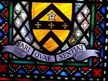 The roof is of slate[1] and the front is of Portland stone,[3] with a design inspired by a tomb in Salisbury Cathedral.[2] Sir Nikolaus Pevsner described the blue and gold vaulted ceiling as "pretty".[1]