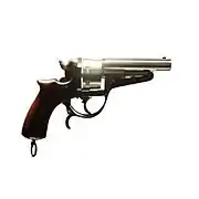 The original Galand revolver was a double-action, open frame (no strap across the top of the cylinder) revolver patented in 1868. Military versions were produced in 9 mm while civilian versions were made in 12 mm. The gun is easily recognizable due to its long extraction lever, which stretches under the gun to form the trigger guard. Pulling the lever forward separates the barrel and cylinder from the rest of the gun. At the same time the extractor plate is blocked which catches any cartridges in the cylinder, thereby extracting them.