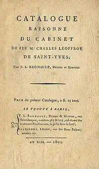 Catalogue of 1805 public auction : Catalogue raisonné du Cabinet de feu Mr. Charles Léoffroy de Saint-Yves. Estampes, tableaux, dessins, miniatures, sculptures, livres etc... Paris, 1805, F.L. Regnault, peintre & graveur et Silvestre, libraire