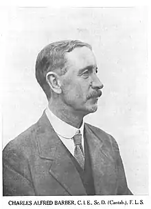 Charles Alfred Barber worked on many aspects of sugarcane breeding and in basic botany. He established a sugarcane research station that is now known as the Sugarcane Breeding Institute at Coimbatore and along with T.S. Venkatraman developed hybrid sugarcane varieties suitable for India. These included hybrids between local and hardy canes from India which are now called Saccharum barberi after him and the tropical high-sugar yielding Saccharum officinarum which did not survive in the winter of northern India.[4] This transfer of commercially useful traits from "noble" cane to Indian cane is referred to the nobilization of Indian canes.[5] He was awarded the Maynard-Ganga Ram prize in 1931.