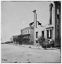During the Civil War, a former house was seriously damaged by shelling. The house at the far right in this 1865 photograph was torn down and replaced by the Charles Drayton House.