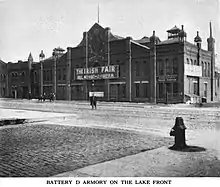 Battery D Armory stood on the east side of Michigan Avenue at Monroe Street. The building was used for various purposes, and "It appears that it occasionally required some pretty quick work to put the building into suitable condition for the morning art classes, after [the building] had been used the night before for a boxing match or a ball."[29] It was demolished in 1896.