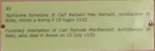 "Charles Raynal McRaynal, son of Maurus Raynal, born of a renowned family in Ireland; well adorned with the gifts of body and mind (and) very skilled in both laws. Archdeacon of Kells of the Diocese of Meath; Counsellor of his illustrious friend Thomas of Kildare; Messenger sent by his superior to Paul III Supreme Pontiff about serious matters especially those pertaining to the Christian Redemption. While he carried out these things in Rome with the greatest faith and integrity. on the day before he was set over the churches Elphin and Clonmaicnois, on account of his merits by the same Paul, Supreme Pontiff. he was suddenly carried off by an incurable fever to the greatest grief of all. He was buried on the Ides of July in the year of Our Lord 1535, in the 38th year of his age.".[27]