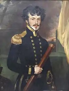 Richardson's rank as a commander was made permanent on 9 October 1802 and he continued in command of Alligator, serving during the Peace of Amiens in the Firth of Forth.[9][44] In April 1803 he was sent to serve on the Leeward Islands Station, at the start of the Napoleonic Wars.[30] Richardson was then given control over the direction of a flotilla that peacefully captured the Dutch settlements of Demerara, Essequibo, and Berbice in September.[9][45] On 27 September he shared in the capture of the Dutch 18-gun corvette Hippomenes.[46] He subsequently fought at the Battle of Suriname on 5 May 1804, where the Dutch colony of Surinam was captured. Alligator assisted at first by bringing the 64th Regiment of Foot ashore; Richardson then went ashore himself and attacked two Dutch forts with a mixed force of sailors and soldiers.[47] Capturing them, he used their guns to fire down upon New Amsterdam.[48] For his efforts in this endeavour he was highly praised in the dispatches sent home after the battle. Richardson was rewarded by the commander-in-chief in the Leeward Islands, Commodore Sir Samuel Hood, with the acting command of his flagship, the 74-gun ship of the line HMS Centaur, on 6 July. His promotion to post-captain in consequence of this was confirmed on 27 September of the same year.[9][49]