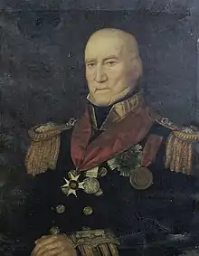 This was Richardson's last active service in the Royal Navy, but he continued to be rewarded and promoted in retirement, becoming a rear-admiral on 10 January 1837, a Knight Commander of the Order of the Bath on 29 June 1841, and a vice-admiral on 17 December 1847.[Note 9][56] In the same year he received the Naval General Service Medal with clasps for the Glorious First of June, Camperdown, Egypt, and the Basque Roads.[80] Richardson had a house built for himself in around 1815, Painsthorpe House in Yorkshire, living there in later life.[81][82][83] He died at Painsthorpe on 10 November 1850, aged eighty-three, from a severe bout of influenza, at the rank of vice-admiral of the white.[Note 10][79][84][85]