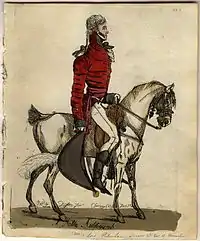 Petersham, the 3rd Earl of Harrington's eldest son, was a Regency era buck. He was educated at Eton from 1793 until 1795 on 7 December of that year, he was commissioned an ensign in the Coldstream Guards.[2] He transferred on 26 November 1799 to become a captain-lieutenant in the 10th (Prince of Wales's Own) Regiment of (Light) Dragoons,[3] and was promoted to captain of a troop on 10 May 1800.[4] Petersham purchased a majority in the Queen's Rangers on 23 February 1803.[5] Shortly thereafter, the regiment was reduced and he was placed on half-pay. On 29 December 1804, he exchanged into the 3rd West India Regiment.[6] He was promoted to the rank of lieutenant-colonel in the Army on 25 June 1807. He went on half pay in August 1812,[7] and was promoted to colonel on 4 June 1814.[8] On 10 March 1812, he was appointed a Gentleman of the Bedchamber to King George III. He continued to serve in that post under King George IV until 1829.[9] The family home in London was Harrington House.