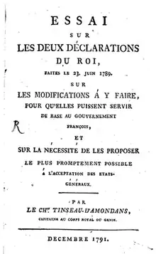 From 1792 he published several politic pamphlets defending the borbonic monarchy against the power of the Etats Generaux.[5] During the Napoleonic period he remained in exile and, probably, acted as an agent of the Allies against France. The intransigence of his political views is evident in the dozen of political writings published between 1792 and 1805.[2]