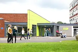 In 1970, a new school was built adjacent to the girls' school on North Downs Road. It cost £370,000, and became known as Cheadle Moseley Boys' Grammar School[3] with 900 boys. The two schools, whilst next to each other, remained separate, despite plans to merge them.[4][5] Moseley Hall was eventually demolished in the late 1970s and replaced by the Village Hotel and an entertainment complex.[6] The boys' school at one time had its own railway line.[7]