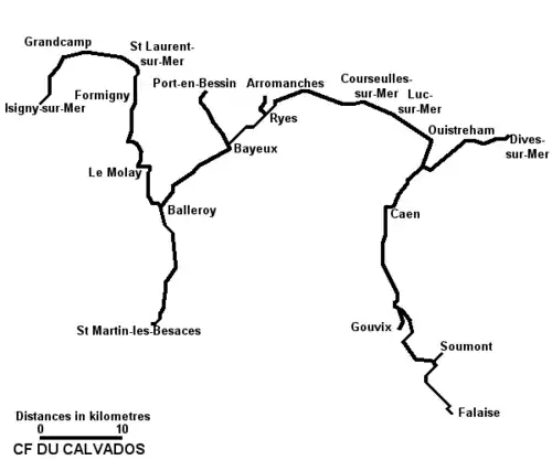 This left two isolated systems, which were joined by laying a dual gauge track on the standard gauge Chemin de fer de Caen à la mer for 8 kilometres (5.0 mi) between Luc-sur-Mer and Courseulles, with a passing loop at St. Aubin-sur-Mer. This link opened to traffic on 1 July 1900.[1] Because of the terms provided in the agreement allowing the construction of the link, it was mainly used for the transfer of stock between each part of the system, which was in effect run as two separate systems.[2] The CFC had a total extent of 234 kilometres (145 mi). There were plans to add a further 369 kilometres (229 mi) of lines, but these plans were abandoned due to improvements in the road system in the département and the extensive network of standard gauge lines.[1]