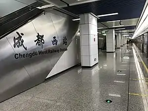 Chengdu West (Chinese: 成都西) is a railway station located in Qingyang District, Chengdu, Sichuan Province, China.[1] It also serves as a transfer station between Line 4 and Line 9 of the Chengdu Metro and Line T2 of the Chengdu Tram.