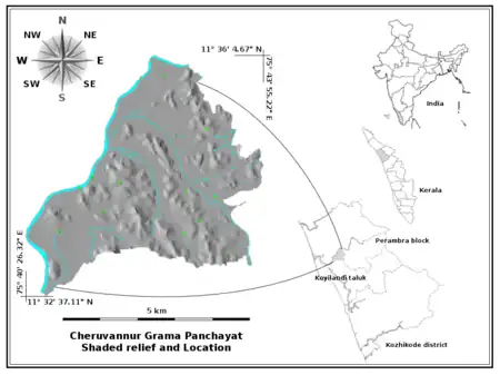Cheruvannur one of the 78 grama panchayats of Kozhikode district, lies between North Latitude 11° 32′ 37.11" and 11° 36′ 4.67", East Longitude 75° 40′ 26.32" and 75° 43′ 55.22". It has a total area of 21.61 square kilometers. The adjoining grama panchayats are Thiruvallur and Velom in the north, Perambra in the east, Nochad, Meppayur, and Thurayur in the south, Maniyur and Thiruvallur in the west.