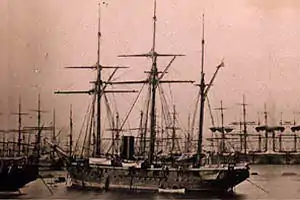 The Chilean corvette Chacabuco was a late 19th-century ship of the Chilean Navy. Commanded by Enrique Simpson in the early 1870s, the ship participated in the exploration of the fjords and archipelagoes of Aysén Region in northern Patagonia.[2] These travels led to the re-discovery of San Rafael Lake and the establishment of Aysén Fjord as the principal access to the inland of Aysén Region.[2] In 1876 Chacabuco transported governor of Magallanes Diego Dublé Almeyda to the Falkland Islands bringing back sheep, thus initiating the Patagonian sheep farming boom of the late 19th century.[3] From 1879 onwards the corvette fought in the War of the Pacific.
