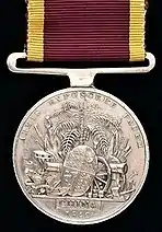 Recipients of this medal who also qualified for the Second China War Medal in 1861 received a clasp inscribed China 1842 to add to their existing medal,[5] in addition to any clasps relating to the second war to which they were entitled. Although these clasps were intended to be fixed to the earlier medal, the different width and style of the two suspenders meant that it was not clear how this was to be done. As a result, the clasps were often simply slipped over the ribbon which was sometimes replaced with the narrower 32mm type supplied with the second medal. Other recipients of the earlier medal replaced the original suspender with one similar to that found on the second medal.[3]