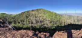 The peak contains one of the southernmost Engelmann spruce stands in the world. There are also extensive stands of quaking aspen on the north slope. Much of the peak was severely burned in recent times, causing aspens to take up once occupied by evergreen trees. Through the trunks of trees, views can be seen northward and westward. This includes views across the Basin and Range to Mount Lemmon, Mount Graham, and Mount Wrightson. In addition, Willcox Playa is visible in the basin below.
