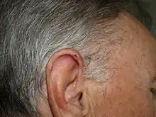 Chondrodermatitis nodularis chronica helicis is a small, nodular, tender, chronic inflammatory lesion occurring on the helix of the ear, most often in men.[2]: 610 it often presents as a benign painful erythematous nodule fixed to the cartilage of the helix or antihelix of the external ear.[3] Although the exact cause of the condition is unknown, it has been linked to head pressure on the ear while sleeping. Treatment options include the use of pressure-relieving devices or, in cases where that is not an option, surgery.[4]