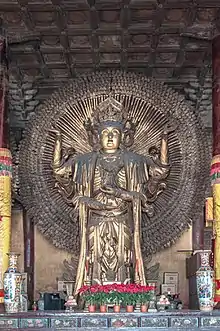 The Hall of Great Compassion is seven rooms wide and four rooms deep with double eaves gable and hip roofs. It still preserves the structural and architectural style in the Ming dynasty. In the middle of the hall placed the statue of Thousand-armed and eyed Guanyin with statues of Thousand-armed and bowls Manjusri and Samantabhadra stand on the left and right sides. The statues were made in the Hongwu period of the Ming dynasty. Each of them is 8.5-metre (28 ft) high.[4]