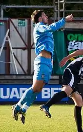 Following Martin Foster's departure, Smith was handed the Tamworth captaincy during the 2009–10 pre-season, which he described as a "massive honour".[112][113] His first appearance of the season came in the opening match, a 1–1 draw away to Stevenage Borough on 8 August 2009.[114] Smith's first goal of the season came after scoring a powerful header in a 2–1 home victory over Wrexham on 25 August 2009.[115] In October 2009, he paid tribute to the defensive partnership he had struck up with Michael Briscoe, saying: "Football is about partnerships on the pitch, having trust in team-mates and good understandings and we seem to have one."[116] Smith suffered a heel injury in October 2009, while also having a hernia problem that possibly needed an operation.[117] After having a hernia operation, he was expected to be ruled out for a long-term period,[118] but returned two weeks later in the following match, a 3–1 home win over Chester City on 14 November 2009.[119] He was handed a one-match suspension after picking up his fifth yellow card of the season in a 0–0 home draw with Forest Green Rovers on 28 December 2009,[120] meaning he missed Tamworth's match against Oxford United on 16 January 2010.[121] His return came in a 0–0 draw away to Gainsborough in the FA Trophy second round on 19 January 2010.[114] After receiving a yellow card in a 1–0 defeat away to Histon on 9 March 2010, he was given a two-match suspension,[122] returning in a 2–0 away defeat by Cambridge United on 24 March.[123] He scored from close range in the 82nd minute for Tamworth's equalising goal in his first match against York since leaving the club, which finished a 1–1 away draw on 27 March 2010.[124] Smith made 38 appearances and scored four goals in 2009–10.[114]