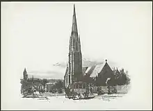 In 1852 land was set aside for a parish district including what is now South Yarra. Community meetings were held in the Ayres Arms Hotel and the South Yarra Hotel (now the Arcadia), and early services were held in the nearby Presbyterian Sunday School.[1] The first vicar was appointed in 1855.[2] The church was dedicated as Christ Church in either late 1855 or early 1856. Construction of the church began in April 1856 following the laying of a foundation stone by Major General Edward Macarthur, and was sufficiently advanced by April 1857 for the first service to be held in it. The church was enlarged in 1860, and was consecrated in 1875 by Dr Samuel Thornton, Bishop of Ballarat. The tower and spire were built later: the foundation stone was laid in 1881 by Sir Henry Brougham Loch, the Governor of the colony. The spire was modelled on that of Salisbury Cathedral. The spire and south aisle were completed in 1886; the north aisle in 1887.[1]