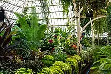 Cuningham House (originally called Winter Gardens) was built in 1923 and opened on 9 August 1924. It is a large, stately structure of architectural importance and is listed with the Heritage New Zealand Pouhere Taonga. A spacious staircase leads to a large peripheral gallery where an extensive collection of tropical plants are displayed such as Dieffenbachia, Peperomia, Hoya, Banana palms, Anthurium and Dracaena. In 2020, a corpse flower bloomed in the house, which was a popular attraction leading to long queues and an extended opening time.[16]