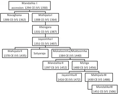 | Mokalasimha/Muktasimha | son of Jayasimha I | 1384–1396 | 1440 | Mokalasimha | Mokalasimha | Muktasimha | |