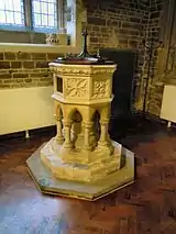 The tower is 43 feet (13 m) high and 10 feet (3 m) wide and was added in the 15th century replacing part of the south aisle.[10] The church was renovated in the late 19th century[11][12] with the tower being rebuilt from well cut sandstone blocks. At this time the organ was installed[13] and was believed to have been from Chicksands Priory.[10]
