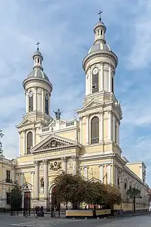 The church is Renaissance Revival in style.[1] On the portico entablature is inscribed: Ad maiorem Dei gloriam ( Ignatius of Loyola's favorite quote), and over the entrance is inscribed the Latin motto: Haec est domus Dei et porta coeli (This is the house of God and the gate of heaven, cite from Genesis 28:17).[3]
