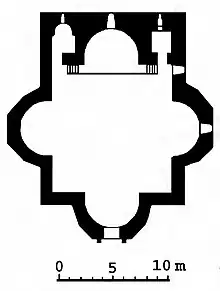 The Church of Saint John (Surp Hovanes), also known as Mastara Church, in Mastara, Armenia dates from the 5th century. It features a variation of the cruciform plan and central cupola'd church. In accordance with its square plan, the four projecting apses, inward-facing circular and outward facing polygonal, offer the requisite supports to hold up the imposing polygonal cupola. The complex church designs are like those in Avan and St. Hripsime Church, Echmiadzin.