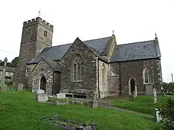 The stone building has a slate roof. It consists of a four-bay, chancel, south transept, and a four-bay north aisle. The two-stage west tower is supported by diagonal buttresses.[1][5] A church may have stood on the site from the 11th century, which was the property of Barlynch Priory.[6]