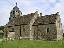 An unusual feature inside the church is two huge tree trunks near the west end which originally supported the bells in the free-standing bell tower.[4] That tower was joined to the chancel by the addition of the nave in the 14th century.[1] There are four bells, three of them cast in the 17th century.[5] The church was restored in 1877–8 by William Butterfield; the work included remodelling the wooden belfry and raising the roofs of the nave and chancel. Julian Orbach, updating Nikolaus Pevsner's description, calls the building "characterful" and writes that "Butterfield's attentions make a serious and coherent interior, still remarkably intact".[6] The building was designated as Grade II listed in 1958.[4]