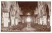 The late 14th century chancel screen (or rood screen), which is in the same line with those of the chapels, is a fine one in carved oak of three bays, and two half bays at the north and south ends. The screen in the north aisle is 15th century with four narrow bays on either side, while that in the south aisle dates to about 1480, with three bays on either side of the doorway.[10] The 15th-century roof of the chancel has moulded wall plates and ties, trusses, with tracery in the spandrels. The wall plates rest on corbels with carved heads. The Norman and Beard organ was installed in 1913 and was restored in the 1990s.