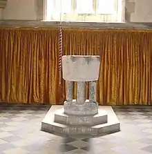 The font is transitional Norman of the late 12th century, belonging to the earliest known church. It has an octagonal bowl with beaded edges and a circular stem flanked by octagonal shafts with moulded bases.[11] The steps and paving on which it stands are very much later - circa 1901. Beside the font is a strong mediaeval iron-bound chest known as a 'Peter's Pence' chest.