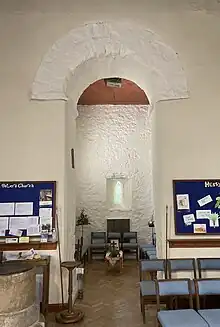 The square unbuttressed tower, chancel and nave arch are of Saxon or of very early Norman date of the 11th-century. The tower arch also dates from the 11th-century and is tall and narrow with a rounded head. In the west wall can be seen traces of a blocked door with a rounded head and in the blocking a 13th-century lancet window. The nave is partly built of massive square stones and in the north wall can be seen a blocked 16th-century four-centred arched doorway and a 14th-century three light window with ogee heads to the lights. The upper part of the chancel and the east wall of the nave were replaced with red brick during the restoration of 1850. The east window three lights and the double chamfered chancel arch are 19th-century. imposts. The south reveal is a reused piece of 10th-century sculpture with two panels of interlace. In the east wall of the nave can be found a piscina, probably reset in the 19th-century with a reset 13th-century cusped head.[1] On the altar rail can be found a small carved mouse, the trademark of Robert 'Mouseman' Thompson.