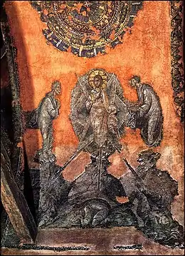 The interior gives a very vertical impression, as the ratio of height to width of the church's central bay is 5 to 1. The interior decoration consists of rich mosaics on the upper levels, inspired by Constantinopolitan models. These are particularly important as some of the last examples of Byzantine mosaics (and the last of its kind in Thessaloniki itself). Frescoes complete the decoration on the lower levels of the main church, but also on the narthex and one of the chapels. These too show influence from Constantinople, and were possibly executed by a workshop from the imperial capital, perhaps the same which decorated the Chora Church. They were probably carried out under the patronage of the hegumenos Paul, after 1314 or in the period 1328–1334.[2][5]