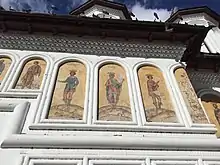 Historian Nicolae Iorga was involved in the latter restoration, suggesting that the spire extensions be removed, the windows narrowed, the facade ledges brought back. The interior paintings were cleaned, while the old exterior frescoes, featuring philosophers and sibyls, were redone by local painter Iosif Keber. Among the figures depicted are Socrates, Aristotle, Pythagoras, Diogenes, Hippocrates and Plutarch. Such subjects are virtually unique for churches in Romania.[1]
