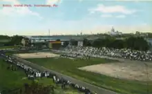 Though originally used for truck farming, amateur games of baseball were played here as early as the 1880s. In 1903, the Harrisburg Athletics professional baseball team and Harrisburg Giants Negro league arrived at Island Park on City Island. Satchel Paige played games at Island Park through the Negro leagues, which were held on the island through 1957.[3] The original Harrisburg Senators played in the Eastern League starting in 1924. Playing its home games at Island Field, the team won the league championship in the 1927, 1928, and 1931 seasons. Babe Ruth famously played a game at Island Park in 1928 when the New York Yankees came to Harrisburg to scrimmage against the original Senators.[4] The Senators played a few more seasons before flood waters destroyed Island Field in 1936, effectively ending Eastern League participation for fifty-one years. In 1940, Harrisburg gained an Interstate League team affiliation with the Pittsburgh Pirates. However, the team remained in the city only until 1943, when it moved to nearby York and renamed the York Pirates.