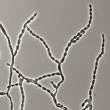 Cladophialophora bantiana exhibits predominantly hyphal growth both in vivo and in vitro.[5] The normal morphology consists of dark coloured largely unbranched, wavy chains of conidia, individually 5–10 µm in length.[5] The dark colour is due to the presence of the dark pigment melanin.[6] Hyphae are septate, as is the case for species belonging to the phylum ascomycota.[1] In samples isolated from cerebral tissue compared to cultured samples, a predominance of unbranched conidial chains and absence of conidiophores has been reported.[5][6] In culture, the colony is black with a velvety texture or dark grey in colour, depending on the type of agar medium it is grown on.[2] Cladophialophora bantiana has been reported to grow in culture under temperatures ranging from 14-42 °C with optimal growth around 30 °C.[2] Cladophialophora bantiana grows slowly in vitro, taking ~15 days to mature when grown at 25–30 °C.[1] Cladophialophora bantiana can be distinguished from other species of the genus Cladophialophora by the presence of the enzyme urease.[7]