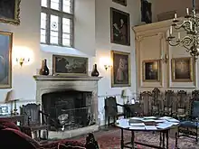 The central and largest room in the house is the great hall which was the original dining room and the accompanying screens passage which gave access to the hall from the service rooms. The staircase to the north of the hall was added in the 18th century. The state room on the western side of the first floor was damaged by fire in 1882; the oak panelling around the fireplace was brought from the Eltons' former house in Queen Square, Bristol. The chapel on the first floor has a rectangular window with reticulated tracery, which dominates the front of the house. The stained glass in the window was added after the 1882 fire.[34] The justice room has had a variety of uses but takes its name from its function as the manorial court until the 18th century.[35] The house contains many family portraits and other pictures as well as collections of Eltonware and Nailsea Glass and prints of bridges and railways.[36][37]