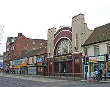 In 1898 William Morton's Theatre Royal showed a 'Veriscope' film, probably the first time any film was shown in a Hull theatre.[1] The Prince's Hall was the first purpose-built cinema in Kingston upon Hull, and was opened in George Street by Morton in 1910 (renamed the Curzon 1955). As Hull embraced the new age of public entertainment, attendances at traditional theatre declined. Luxurious cinemas, taking their inspiration from theatres and music halls, were built to accommodate audiences in almost every neighbourhood in the city.[2] By 1914, there were 29 cinemas, theatres and halls showing films in the city. The London and Provincial Cinema Company owned the Hippodrome; the National Electric Picture Theatres owned the Theatre de Luxe, but Morton's was the largest and most influential cinema chain in Hull.[1]