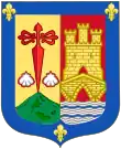 BlazonPer pale 1 or, a cross of St. James gules between two escallops argent fimbriated gules, in base a mount vert; 2 gules a castle, on a bridge, or on a river barry wavy argent and azure; all within a bordure azure charged with three fleurs-de-lis or.