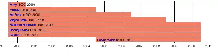 | University of Alabama in Huntsville | Huntsville, Alabama | Chargers | 1999–2010 | 2007, 2010 | Independent[22] | dropped program[23] | |