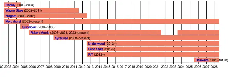- ↑ RMU dropped men's hockey at the same time it dropped the women's team. The men's team also resumed play in 2023, rejoining its former men's home of Atlantic Hockey.