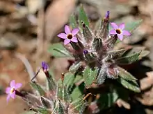 Collomia diversifolia is a species of flowering plant in the phlox family known by the common name serpentine collomia. It is endemic to California, where it is a member of the serpentine soils flora in the North Coast Ranges from the northern San Francisco Bay Area to Shasta County. It is a small annual herb with many branches bearing dark lance-shaped leaves, the most basal ones having three small teeth. Leaves and stems are lightly to densely covered with glandular hairs. The inflorescence is a cluster of several flowers each about a centimeter wide. The star-shaped flower has pointed violet lobes with yellowish bases coming together at a purple throat.