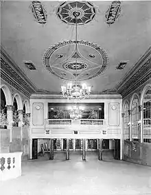 The interior had a three-story auditorium with two balconies. The marble used was rose Tavernell imported from France. The three grand chandeliers lit the long center ramp that swept up to the interior doors. Set in the marble arches of the columns were baskets of flowers, gifts from Wilmer's and Vincent's many clients in the theater world.[1]