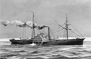 The Patrick Henry was specially modified to serve as the school ship in May 1862 when she was sent to the Rockets Navy Yard in Richmond. All but four of her guns had been mounted at the naval battery at Drewry's Bluff on the James River. The four remaining guns were used for gunnery drills and training of the midshipmen, and served to assist, when necessary, in the defense of that river location. Two class rooms made of pine boards were mounted amidships on the gun deck between the paddlewheel boxes, and an oversized fully rigged mast was placed forward for sail handling and training. Finally a small launch armed with a twelve-pound howitzer was kept on davits for training.[6]