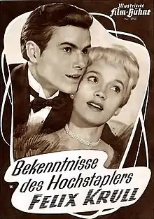Confessions of Felix Krull (German: Bekenntnisse des Hochstaplers Felix Krull, lit.'Confessions of the Imposter Felix Krull') is a 1957 West German comedy and drama film directed by Kurt Hoffmann and starring Horst Buchholz, Liselotte Pulver, and Ingrid Andree.[1][2] It is based on the 1954 novel of the same title by Thomas Mann. The story was later made into a 1982 television series The Confessions of Felix Krull. It was shot at the Wandsbek Studios in Hamburg and on location in Lisbon. The film's sets were designed by the art director Robert Herlth. Mann's novel was made into a movie again in 2021.[3]
