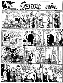 When Connie's daily strip began, on May 13, 1929, she became "flighty" in a different sense. There, she was played as an adventuring aviator, and the strips her series fit right in with included Tailspin Tommy, Skyroads and the early Brick Bradford—except, of course, for her gender. Connie was the first female adventure hero in American comics, the precursor to Brenda Starr, Reporter, Deathless Deer, Modesty Blaise and all the rest. Connie (last name Kurridge—sounds like "courage", get it?) was deceptively pretty, tho as a product of the flapper era, rather flat-chested compared to modern comics women. Neither villains nor readers back then expected to find an agile and resourceful brain beneath her lovely blonde curls. And she was capable of spectacular feats of derring-do, such as flying great distances cross-country in an unfamiliar plane, at night, with neither navigational equipment nor lights; or performing stunt flights in a plane she knew had recently been sabotaged.[4]